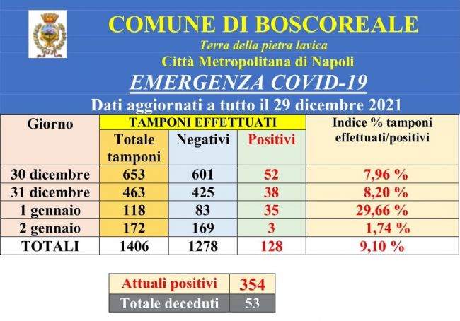 In città prosegue irrefrenabile l’aumento dei contagi da Covid-19. In soli quattro giorni, dal 30 dicembre al 2 gennaio, gli attuali positivi sono passati a 354 (al 29 dicembre erano 243). Un dato decisamente allarmante che denota come anche nella nostra città il contagio sta dilagando. Suscita allarme anche l’indice di contagio relativo all’incidenza percentuale dei nuovi positivi a sette giorni per centomila abitanti, che nella settimana dal 27 dicembre al 2 gennaio è letteralmente schizzato al 926,30 % (la precedente settimana era al 246,28 %); analogo balzo si è registrato anche nel dato regionale che è pari all’1.085,49% (la precedente settimana era al 349,48%). Per rendere l’idea, basti pensare che appena un mese fa l’indice percentuale in città era appena al 91,89%.