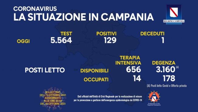 Sono 129 i casi positivi al Covid in Campania, nelle ultime 24 ore, su 5.564 test esaminati. Come dopo ogni fine settimana, quando il numero dei test diminuisce, aumenta il tasso di incidenza.