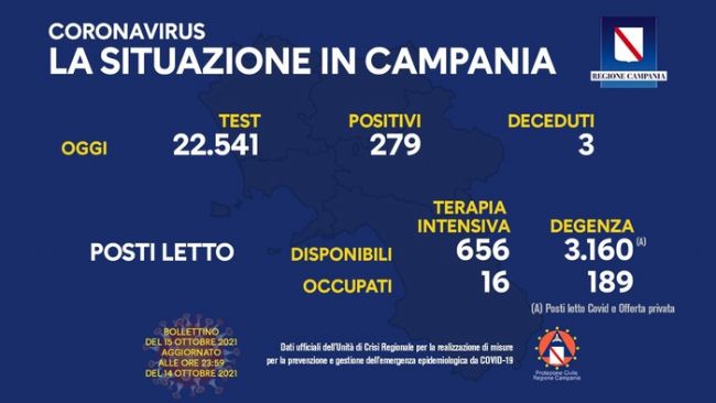 Scende, in Campania, l'indice di contagio. Nelle ultime 24 ore sono 279 i casi positivi al Covid su 22.541 test esaminati.