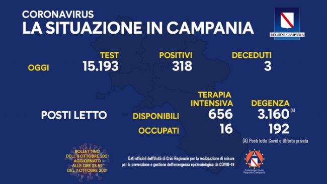 Continua a salire anche se di poco, in Campania, l'indice di contagio. Nelle ultime 24 ore sono 318 i casi positivi al Covid su 15.193 test esaminati.