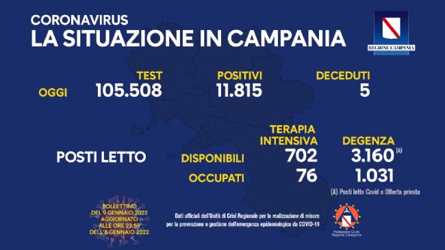 Sono 11.815 in Campania, nelle ultime 24 ore, i casi positivi al Covid su 105.508 test esaminati; sostanzialmente stabile l'indice di contagio che passa dall'11,21% di ieri all'11,19% di oggi.