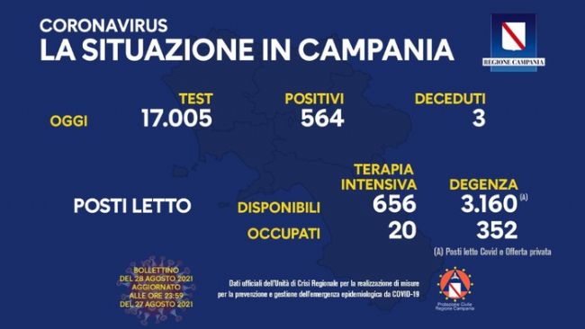 Sono 564 i nuovi positivi al Covid in Campania, su 17.005 test processati. Il tasso di incidenza è in lieve calo e si attesta al 3,31%, contro il 4,02 di ieri.