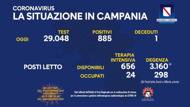 Sono 885, in Campania, i casi positivi al Covid nelle ultime 24 ore su 29.048 test esaminati. Resta sostanzialmente stabile l'indice di contagio che ieri era pari al 3,18% ed oggi è al 3,04%.