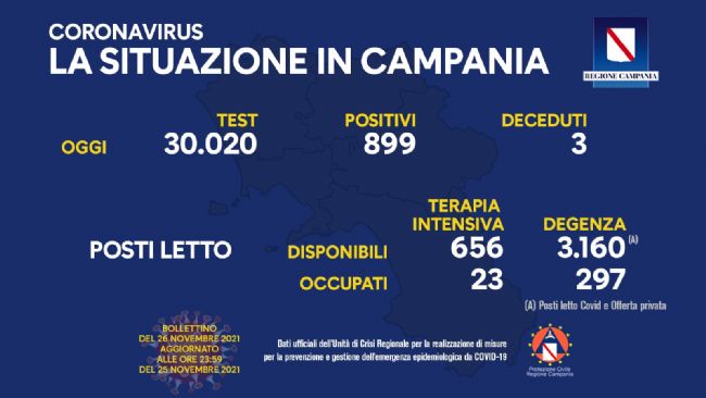 Sono 899 i casi positivi in Campania nelle ultime 24 ore su 30.020 test esaminati. Cala il tasso di contagio che ieri era pari al 3,45% ed oggi è 2,99%. Tre i decessi. Negli ospedali aumentano a 23 i posti letto occupati nelle terapie intensive (+ 2), mentre calano a 297 in degenza (-12).