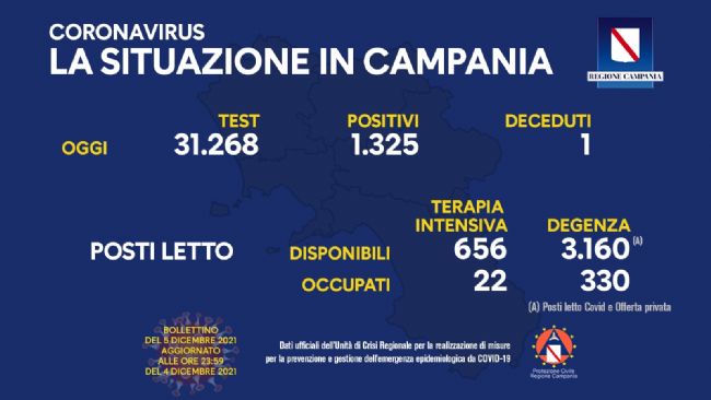 Dai dati del bollettino quotidiano dell'unità di crisi regionale emerge che sono 1.325 i positivi su un totale di 31.268 test per un tasso del 4,23 contro il 3,69 di ieri.
