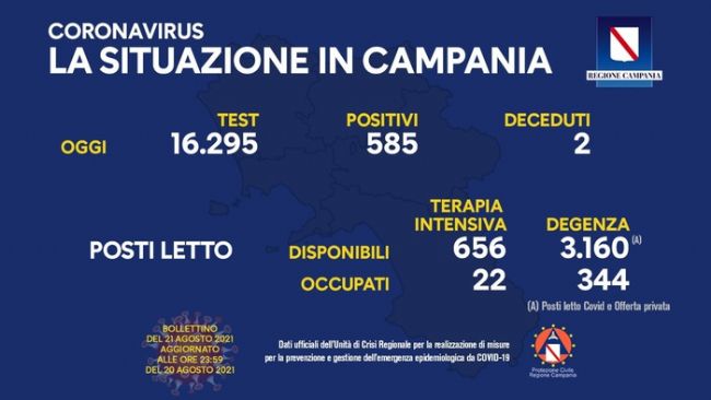 Sono 585 le persone risultate positive al Covid oggi in Campania a fronte di 16.295 test effettuati (il tasso di positività scende ancora e passa dal 4,12% al 3,59%). Le persone decedute, nelle ultime 48 ore, come informa l'Unità di Crisi della Regione, sono 2.