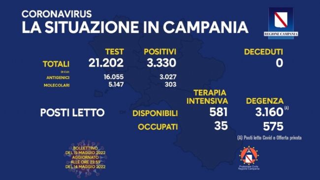 Cala il tasso di incidenza del Covid in Campania, in un giorno nel quale il bollettino della Regione non registra vittime. I nuovi positivi sono 3.330su 21.202 test esaminati: il rapporto è del15,70%, contro il 16,98 di ieri. Resta sostanzialmente stabile l'occupazione dei posti letto, che sono 35 nelle intensive (-1) e 575 in degenza (+2).