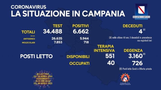 Sono 6662 i positivi del giorno in Campania su 34.488 test effettuati per un indice di contagio pari al 19,31%, in lieve aumento rispetto al dato registrato ieri del 18,7%, ma stabilmente sotto il tetto del 20%. Quattro le persone decedute nelle ultime 48 ore alle quali vanno aggiunte altre tre morti dei giorni precedenti ma registrate nella giornata di ieri. Quanto al report dei posti letto su base regionale scendono di due unità, da 42 a 40, quelli di terapia intensiva occupati e da 746 a 726 (-20) i posti letto di degenza ordinari occupati.