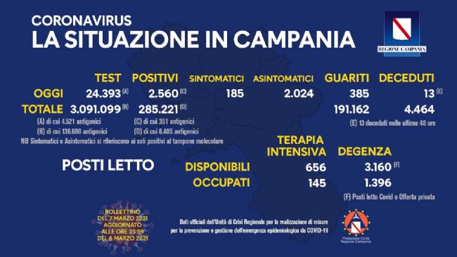 I tamponi del giorno ammontano a 24.393 (di cui 4.521 antigenici). Il totale dei positivi è 285.221 (di cui 8.405 antigenici). Il totale dei tamponi 3.091.099 (di cui 136.690 antigenici);.