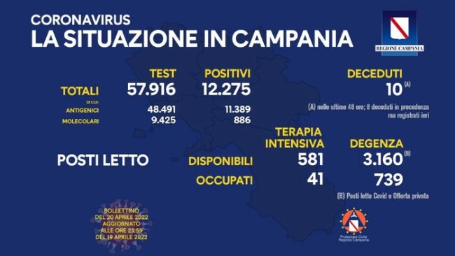 Ammontano a 12.275 i positivi al Covid del giorno in Campania su 57.916 test effettuati, per un indice di contagio che si attesta al 21,2%, in calo di un paio di punti rispetto al dato di ieri del 23,17%. Sono dieci le vittime delle ultime 48 ore, cui vanno aggiunti 8 morti risalenti ai giorni scorsi ma registrati solo ieri. Scendono anche i posti letto di terapia intensiva occupati: oggi sono 41 (-4 rispetto al dato di ieri di 45). In aumento i posti letto di degenza occupati: 739 con un +41 rispetto ai 698 di ieri.