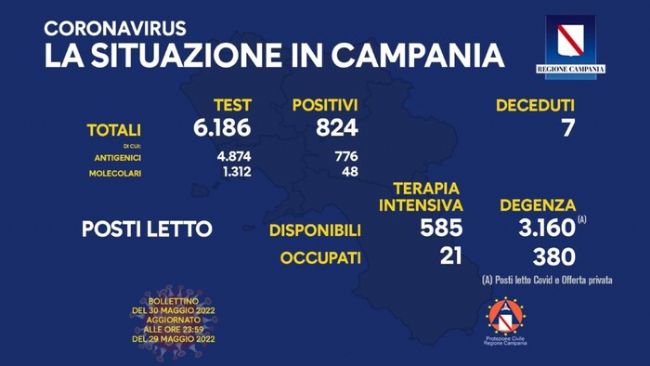 Resta stabile, in Campania, il tasso di contagio. Secondo il bollettino ordinario della Regione Campania, sono 824 i neo positivi al Covid su 6.186 test esaminati. Ieri il tasso di contagio, con un numero di test nettamente più alto, era pari al 13.37%, oggi è pari al 13,32%. Sette i decessi. Negli ospedali, restano quasi del tutto invariati i ricoveri nelle terapie intensive con 21 posti letto occupati (-1 rispetto a ieri); continuano a calare, invece, i ricoveri in degenza con 380 posti letto occupati (- 7 rispetto a ieri).