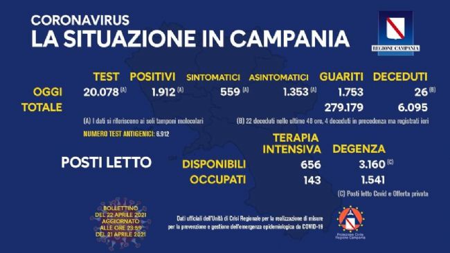 Resta stabile il quadro dei contagi covid in Campania rispetto a ieri: i nuovi positivi sono 1.912, di cui 559 sintomatici, su 20.078 test molecolari esaminati. Il tasso di incidenza risulta del 9,52%, contro il 9,23 del bollettino precedente.