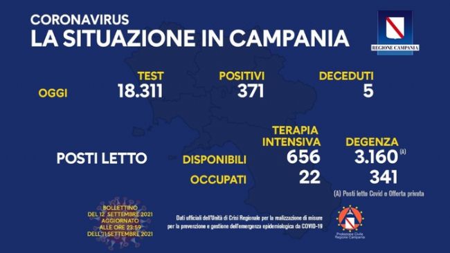 Dati in calo in Campania sul fronte Covid. Si registrano 371 positivi su un totale di 18.311 tamponi esaminati: il tasso è del 2,02% rispetto al 2,23% precedente. I morti sono cinque. In terapia intensiva ci sono 22 persone (una in più rispetto al dato precedente) e 341 quelle in reparti di degenza ordinaria (una in meno, erano 342).