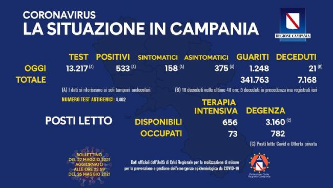 Risale l'indice di positività in Campania. Secondo i dati dell'Unità di crisi della Regione, nelle ultime 24 ore sono 533 i casi positivi su 13.217 tamponi molecolari esaminati.