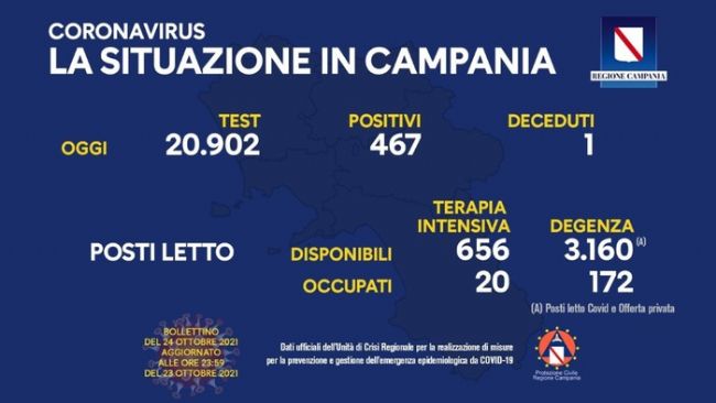 Continua a crescere il tasso di incidenza per il Covid in Campania: si passa dall'1,92% di ieri al 2,23% di oggi. Secondo i dati dell'Unità di crisi della Regione sono 467 i positivi su 20.902 test. Si registra un morto. Stabile l'occupazione dei posti letto in terapia intensiva (20 ricoverati) mentre continuano a calare quelli in degenza: 172 (meno 4).