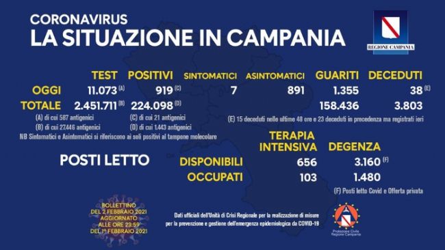 Si segnalano altre 38 vittime, 15 nelle ultime 48 ore e 23 risalenti ai giorni precedenti ma registrate oggi. In rialzo le occupazioni di posti letto, +6 in terapia intensiva (totale 103), +43 in degenza (totale 1.480).