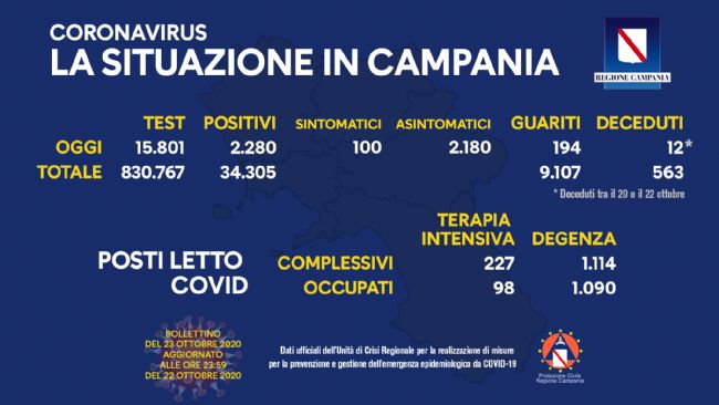 Come anticipato poco fa dal governatore De Luca sono 2.280 i nuovi positivi al Covid rilevati ieri in Campania, nuovo record di contagi mai toccato finora. Di questi, 100 sono i sintomatici. Sono stati 15.801 i tamponi eseguiti. Il bollettino dell'Unità di crisi, aggiornato alla mezzanotte scorsa, segnala anche 12 nuove vittime (decedute tra il 20 e il 22 ottobre) e 194 guariti. Il report dei posti letto segnala che in terapia intensiva sono occupati 98 posti sui 227 disponibili, mentre è in forte affanno il comparto delle degenze ordinarie Covid: i posti letto occupati sono 1.090 su 1.114, in pratica saturazione completa mentre si lavora per rendere liberi nuovi reparti ospedalieri finora adibiti ad altre attività.
