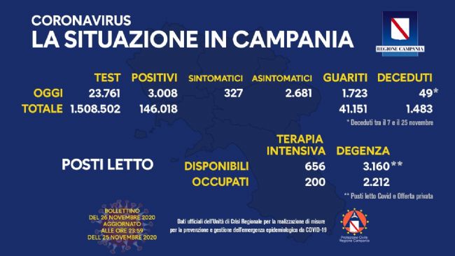 I deceduti sono 49, tra il 7 ed il 25 novembre, per un totale di 1.483. I guariti sono 1.723, il totale arriva a 41.151. Il report su base regionale evidenzia che a fronte di 656 posti letto di terapia intensiva disponibili ne risultano occupati 200. I posti letto di degenza disponibili sono 3.160 tra posti letto Covid ed offerta privata mentre quelli occupati sono 2.212.