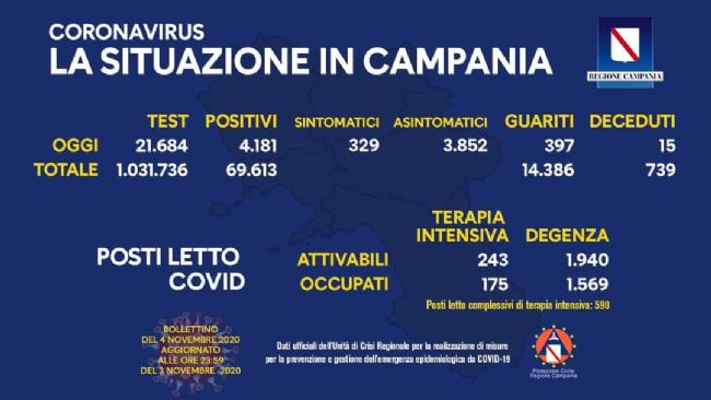 Cala, in Campania, la percentuale rapporto positivi-tamponi che oggi si attesta al 19,2 % (ieri era pari al 21,5%), ma in termini oggettivi il numero dei positivi sfonda per la prima volta quota 4mila. Secondo quanto rende noto l'Unità di crisi della Regione Capania, oggi i positivi sono 4.181 (solo 329 sintomatici) su 21.684 tamponi esaminati. Calano anche i decessi, 15 (ieri erano 24) e calano i guariti 397 (ieri erano 998). Questo, invece, il report posti letto su base regionale: Posti letto di Terapia intensiva complessivi: 590. Posti letto Covid: Posti letto di terapia intensiva attivabili: 243; Posti letto di terapia intensiva occupati: 175 ; Posti letto di degenza attivabili: 1.940; Posti letto di degenza occupati: 1.569