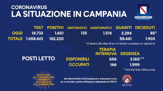 Secondo quanto rende noto l'Unità di crisi della Regione Campania sono 1.651 le persone risultate positive nelle ultime 24 ore - 135 i sintomatici - su 18.733 tamponi esaminati. Alto, invece, il numero dei decessi 42 nelle ultime 48 ore e 43 deceduti in precedenza ma registrati ieri;.