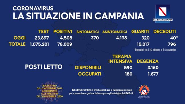Gli asintomatici sono 4.138, i sintomatici 370. Il totale dei positivi è di 78.009, quello dei tamponi è di 1.075.201. I deceduti tra il 12 ottobre ed il 5 novembre sono 40. I guariti del giorno sono 320. I posti letto di terapia intensiva disponibili sono 590, di cui occupati 180. I posti letto di degenza disponibili sono 3.160, di cui occupati 1.677.