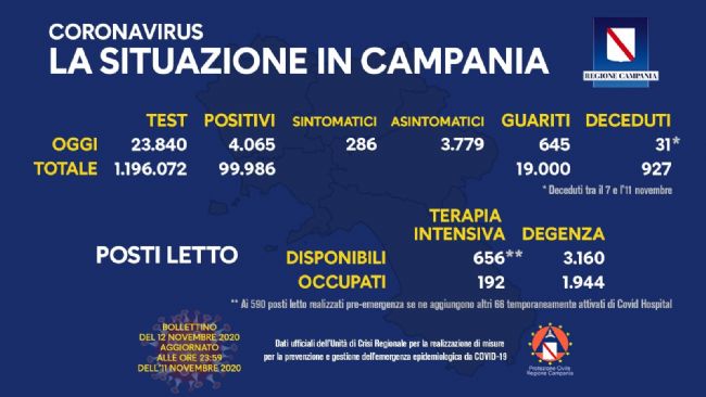 Di seguito il report posti letto su base regionale: Posti letto di terapia intensiva disponibili: 656 (Ad oggi la dotazione dei posti letto di terapia intensiva della Regione Campania è costituita dalla somma dei 590 posti letto realizzati pre-emergenza e dei posti letto in più temporaneamente attivati per il Covid: 66 (Covid hospital). Posti letto di terapia intensiva occupati: 192. Posti letto di degenza disponibili: 3.160. Posti letto di degenza occupati: 1.944