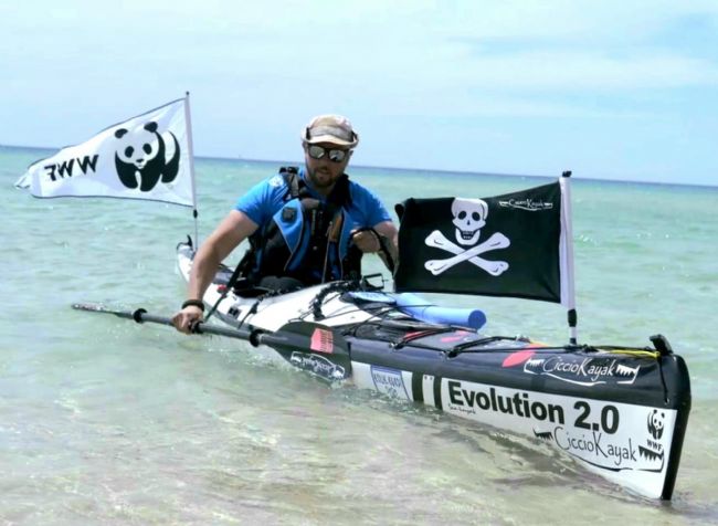 Giro in kayak in Campania per la sua campagna di sensibilizzazione.