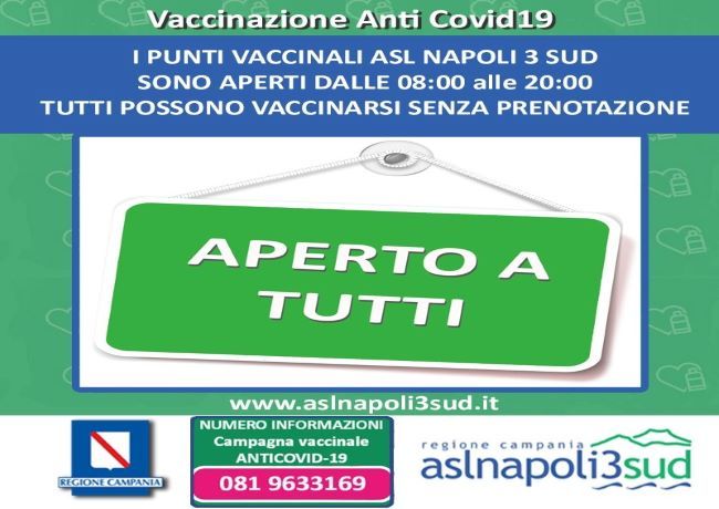 Le porte dei 35 punti vaccinali presenti sul territorio Asl Napoli 3 Sud sono aperte a tutti ininterrottamente dalle 8:00 alle 20:00. Chiunque può presentarsi al punto vaccinale più vicino alla propria residenza o in qualunque altro centro vaccinale aziendale e ricevere la vaccinazione senza la necessità di avere una prenotazione.