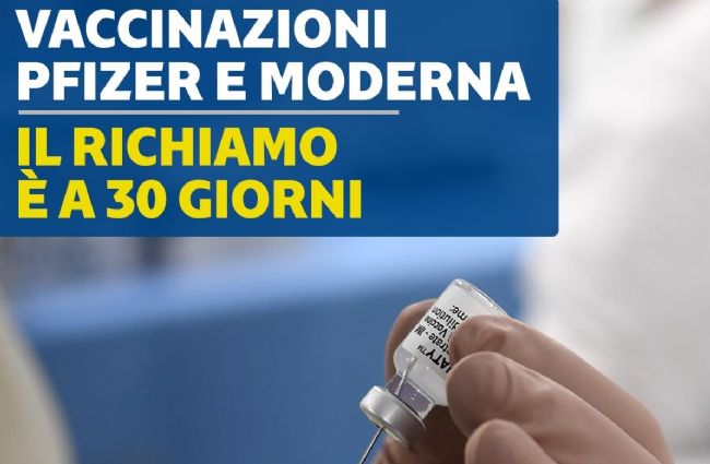 L'Unità di Crisi ha dato mandato alle Aziende Sanitarie di prevedere l'intervallo di tempo tra la prima e la seconda dose a 30 giorni, in ragione del nuovo programma di consegne comunicato dalla Struttura Commissariale. Pertanto, i cittadini che da domani riceveranno la prima dose di Pfizer o Moderna saranno convocati dopo 30 giorni per il richiamo, mentre quelli già vaccinati ad oggi saranno convocati entro i 21 giorni (Pfizer) o 28 giorni (Moderna) e comunque non oltre il 30esimo giorno dalla prima inoculazione.