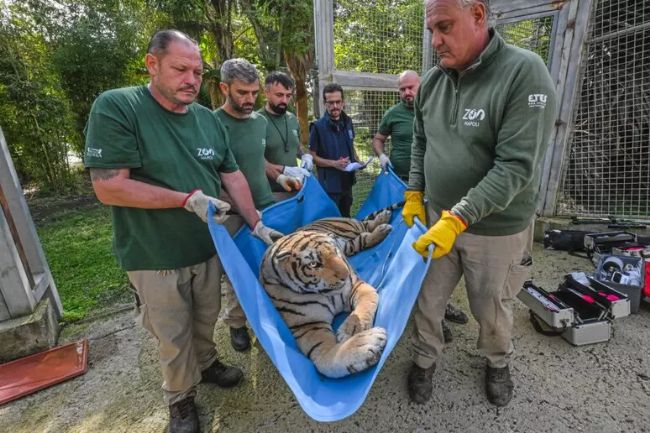 Protagonisti due ospiti in carne della struttura, un lemure e un alpaca, ma anche - ed è la vera curiosità - un peluche di tigre a grandezza naturale che è stato narcotizzato come fosse in carne e dopo alcuni minuti collocato su un camion pronto a partire per la destinazione stabilita per accoglierlo.