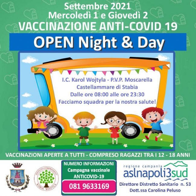 Vaccini ad oltranza senza prenotazioni nel centro vaccinale di Castellammare di Stabia. Mercoledì 1 e giovedì 2 settembre, il centro vaccinale istituito nella scuola “Karol Woytjla” di Moscarella ospiterà l’“open night & day”, con apertura prevista ininterrottamente dalle ore 8.00 alle ore 23.30 per somministrare vaccini a tutti quelli che ne faranno richiesta, muniti di documento di identità e tessera sanitaria, nonché ai ragazzi di età compresa tra i 12 e i 18 anni. Non ci sarà bisogno di alcuna prenotazione preventiva, dal momento che sarà possibile registrarsi direttamente in loco per poi sottoporsi al vaccino nelle postazioni istituite dall’Asl Napoli3 Sud, in sinergia con l’amministrazione comunale di Castellammare di Stabia.