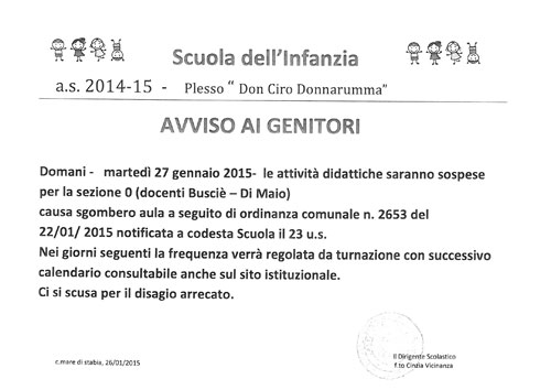 Alunni del III circolo di Castellammare di Stabia, Don Ciro Donnarumma, sfrattati dal comune. Una presa di posizione forte da parte dell'amministrazione comunale, che segue le polemiche nate in passato tra la scuola materna e l'asilo nido che condividono la stessa struttura di via Martucci. Il numero elevato di iscrizioni presso la scuola materna, aveva costretto Palazzo Farnese a concedere un'aula inizialmente appartenente all'asilo nido e a bloccare le iscrizioni per l'anno in corso. La notifica di sfratto esecutivo è giunta venerdì alla direttrice Cinzia Vicinanza ma con la promessa di imminenti lavori di ampliamento al seminterrato da mettere a disposizione della scuola materna. Una nuova classe, quindi, ma che in realtà è già a disposizione della scuola : nonostante i 9 mila euro spesi per la messa a norma, non è mai stata utilizzata a causa della mancanza del certificato di idoneità. Questa mattina è andata in scena la protesta dei genitori che non intendono trasferire i propri figlioletti in altra struttura o in locali non a norma. Di qui la decisione da parte della dirigente di sospendere le attività didattiche per la sezione 0 nella giornata di domani. Nei giorni successivi verrà ripristinata la normale frequenza adottando una turnazione tra le classi. Una decisione che sicuramente farà parlare ancora molto nei prossimi giorni.