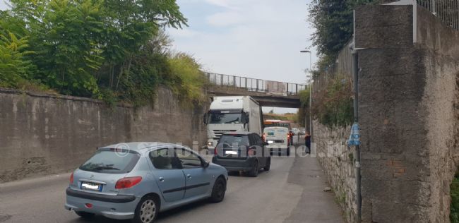 "Lasciate ogni speranza oh voi che...passate". Sembra essere questo il monito che ormai da alcuni mesi accompagna il ponte di via Madonna della Grazie, sulla strada che porta a Gragnano e Santa Maria la Carità. Nella tarda mattinata di ieri un altro mezzo pesante, l'ennesimo, è finito per restare bloccato mentre transivata sotto al cavalcavia. Ormai, quello dei tir incastrati, pare essere diventato un fastidioso rito che si abbatte sulla circolazione locale a cadenza trimestrale, visto anche il dislivello del ponte da una carreggiata all'altra.
