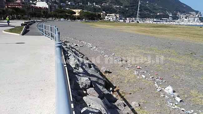 «Il Comune aveva garantito una pulizia costante dell’arenile – dice Andrea Lambiase, volontario a tempo pieno in questo tratto di lungomare – Il trattore si è visto solo poche volte, poi nulla. In queste rocce lasciate tra la villa e l’arenile si accumulano rifiuti di ogni tipo che nessuno provvede a rimuovere. I giardinetti della villa sono poco curati, e le piante che ne delimitano il confine con la strada sono incolte da settimane. Come è possibile tutto questo ? La ditta incaricata della raccolta e smaltimento rifiuti ha assunto da qualche giorno diversi nuovi operai stagionale, perché non li mette all’opera qui sull’arenile ? Ed i lavori bloccati ? Chi ci deve dare conto a noi cittadini di tutto ciò ? Noi che paghiamo le tasse per vedere poi che i soldi vengono sperperati in questo modo ? Dobbiamo scendere in piazza a protestare, solo così può essere si smuova qualcosa».