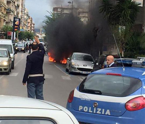 Auto in fiamme al Viale Europa. E' successo alle 13.40 circa davanti al negozio Ottica Russo. Per motivi ancora sconosciuti, una macchina ha preso fuoco facendo alzare una densa e scura colonna di fumo. Sul posto sono intervenuti i vigili del fuoco, ma i primi ad arrivare sono stati gli agenti di polizia che hanno bloccato il traffico stradale. Per loro è stato complicato tenere a bada i molti curiosi che, inconsci del pericolo, hanno cercato di avvicinarsi il più possibile per ammirare da vicino ciò che stava accadendo. Fortunatamente, però, non si sono registrati feriti ma solo tanto spavento.