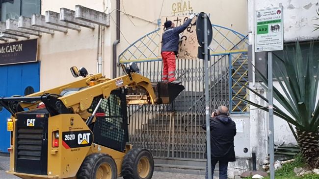 Intento a sistemare un cartello sul cancello d’ingresso al palazzetto del Mare. Nulla di male se non fosse che per farlo si è servito del braccio meccanico di una escavatrice. Il tutto senza indossare un casco protettivo.