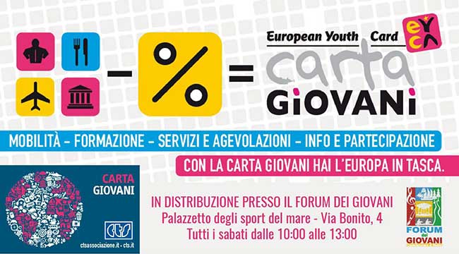 Approda nella città delle acque il circuito della Carta Giovani Europea. Una tessera associativa di rilevanza Comunitaria per tutti i giovani di età compresa tra i 14 e i 30 anni. Ad oggi vi aderiscono 38 organizzazioni in 36 Paesi europei e i possessori sono circa 5 milioni. Il “taglio del nastro” è avvenuto per mano dei consiglieri del Forum dei Giovani Coppola e Polito nella sede romana del Centro Turistico Studentesco, l’ente nazionale erogatore del servizio. Molte attività cittadine hanno già aderito grazie anche al contributo dei Consiglieri Carolei e D’Averio. E’ stato fatta una mappatura del territorio e cercato di convenzionare i punti strategici di interesse giovanile e coprire tutti i tipi di settore e si è riuscito a convenzionare, per ora, circa 30 attività. La card è nominale ed ha un costo di 10 euro, spese per la gestione del circuito internazionale ed è possibile richiederla tutti i sabato dalle 10 alle 13 presso il Palazzetto del Mare. Qualsiasi attività può convenzionarsi ancora.