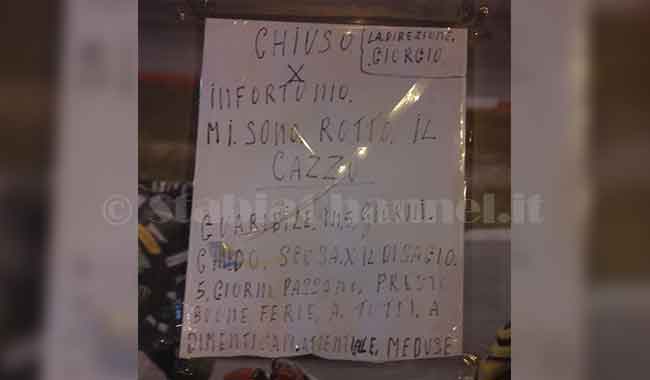 “Chiuso per infortunio. Mi sono rotto il c…o. Guaribile in 5 giorni. Chiedo scusa per il disagio, 5 giorni passano presto. Buone ferie a tutti. La Direzione. Giorgio”.