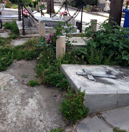 Pavimentazione sconnessa, mattoni abbandonati ai lati del viale, ma soprattutto erbacce alte più di un metro la fanno da padrone in quello che ormai non è più un luogo di sepoltura ma un campo incolto.