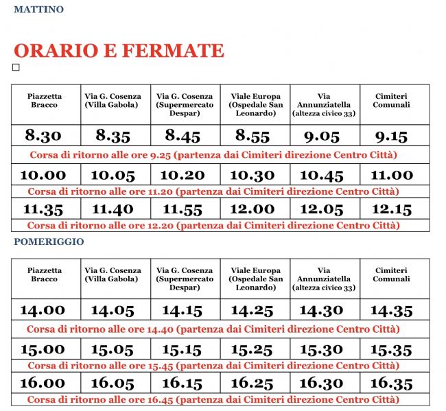 Sono inoltre state previste navette gratuite che da vari punti della città conducono ai cimiteri comunali. Gli orari sono ed i punti di partenza sono indicati nell’immagine in alto.