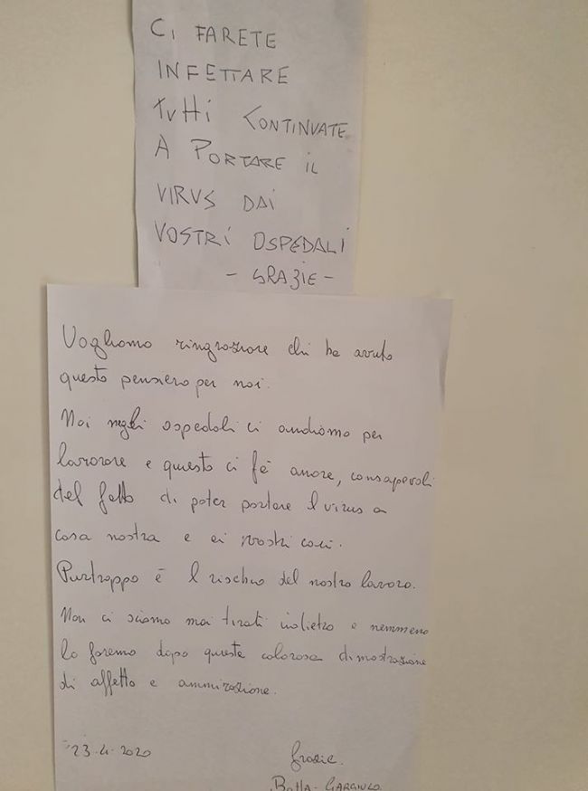 «Ci farete infettare tutti. Continuate a portare il virus dai vosti ospedali». È questo il messaggio che un infermiere di Castellammare di Stabia, Afredo Botta, ha ritrovato quest'oggi all'interno della sua buca postale. Un bigliettino anonimo che accusa l'operatore sanitario di trasferire il Covid-19 all'interno del palazzo nel quale vive. Un gesto poco nobile che comunque non ha scoraggiato l'infermiere che ha deciso di rispondere agli ignoti: «Vogliamo ringraziare chi ha avuto questo pensiero per noi - si legge nella lettere di risposta -. Noi negli ospedali ci andiamo per lavorare e questo ci fa onore, consapevoli del fatto di poter portare il virus all'interno delle nostre case. Purtroppo è il rischio del nostro lavoro: non ci siamo mai tirati indietro e nemmeno lo faremo dopo questa calorosa dimostrazione di affetto e di ammirazione».