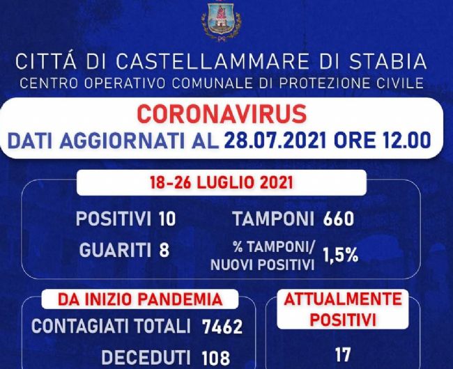 La Regione Campania e l’Asl Na 3 Sud hanno comunicato che sono 10 i cittadini di Castellammare di Stabia risultati positivi al coronavirus (Covid-19) dal 18 luglio al 26 luglio 2021. Solamente 1 persona sta accusando sintomi lievi della malattia. Sono stati lavorati complessivamente 660 tamponi per cui la percentuale dei nuovi positivi rispetto ai tamponi effettuati è all’1,5%. 8, invece, i cittadini di Castellammare che hanno sconfitto il coronavirus. I dati sono stati resi noti dal sindaco Gaetano Cimmino che ha anche ricordato che l'Asl Na 3 Sud ha attivato un servizio informativo telefonico specifico al numero 081 9633169 per informazioni sulla campagna vaccinale. L'obiettivo è quello di fornire informazioni complete, obiettive ed accurate per favorire un'ampia adesione alla campagna vaccinale contro il Covid-19.