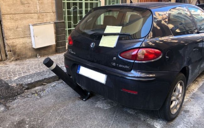 E' successo questa mattina in Via Alvino, alle ore 12.30. I proprietari di queste due automobili dovranno pagare una multa da 344 euro, i costi di ripristino del paletto danneggiato e le spese di recupero della vettura, prelevata poco fa con il carro attrezzi.