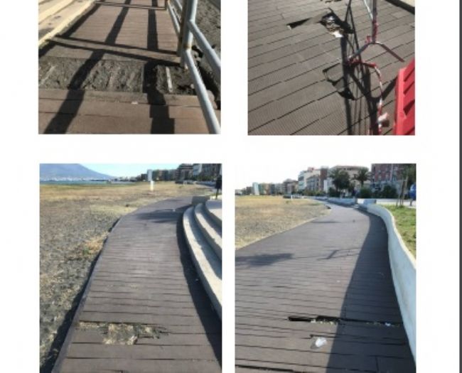 In una lettera indirizzata a sindaco, assessori e dirigenti comunali competenti, il presidente Vincenzo Guadagno mette in risalto «le condizioni della passerella pedonale. Quest’ultima, fin dalla sua inaugurazione, ha evidenziato imperfezioni costruttive, ma con il passare del tempo mostra un 2 numero sempre maggiore di doghe divelte e danneggiate, tanto da costituire uno stato di pericolo specialmente per bambini ed anziani. Inoltre, come è facile constatare, il piano sottostante alla passerella è luogo di vita e di rifugio di ratti ed insetti vari attirati dai residui di cibo che vi si depositano. Senza parlare delle innumerevoli cicche di sigarette che molti non depongono negli appositi contenitori e che si vanno a incastrare negli interstizi delle doghe».