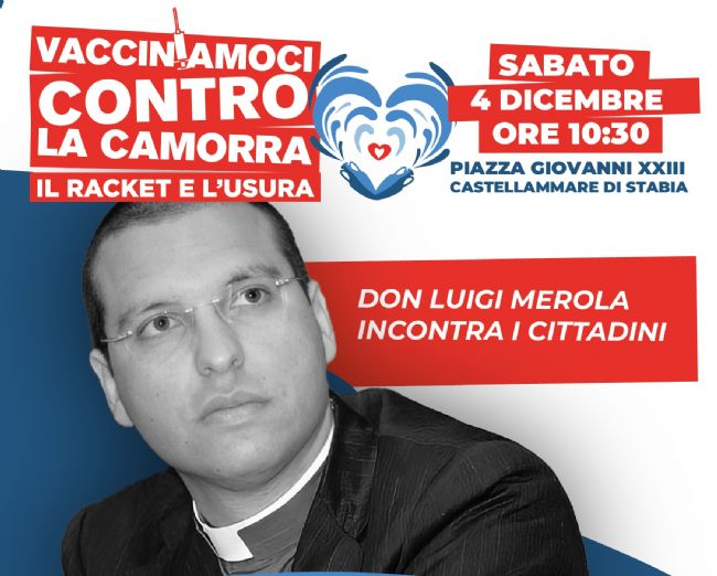 Sarà don Luigi Merola, parroco anticamorra e fondatore de ‘A voce d'e creature, che offre accoglienza e servizi ai ragazzi, il prossimo ospite della campagna di comunicazione e di sensibilizzazione “Vacciniamoci contro la camorra, il racket e l’usura”. Il progetto messo in campo dall’amministrazione comunale di Castellammare di Stabia tornerà in piazza Giovanni XXIII sabato 4 dicembre alle ore 10 e 30. Il primo appuntamento, sabato 20 novembre, ha avuto come ospiti don Ciro Cozzolino, referente del presidio di Libera di Torre Annunziata, e don Gennaro Giordano, che hanno dialogato con i cittadini e gli studenti delle scuole stabiesi.