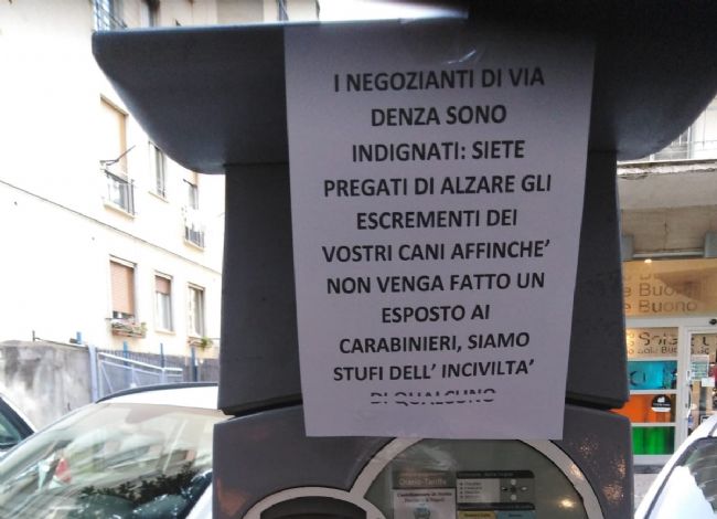 Escrementi di animali davanti alle proprie attività commerciali. Un problema che persiste, oltre ad essere una situazione che si verifica anche in altre strade della città. Sul parcometro di via Denza è stato affisso un avviso, nel quale i negozianti lamentano dell’inciviltà di coloro che non si apprestano a raccogliere gli escrementi dei propri animali davanti all’entrata dei negozi. Secondo il suddetto avviso, «i negozianti di via Denza sono indignati: siete pregati di alzare -hanno scritto- gli escrementi dei vostri cani, affinché non venga fatto un esposto ai carabinieri, siamo stufi dell’inciviltà di qualcuno.»