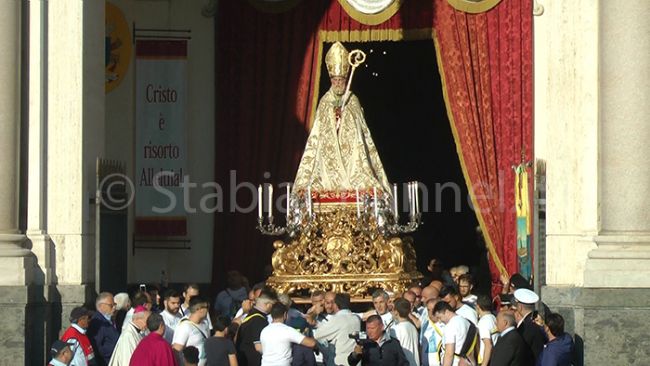 Migliaia di fedeli per la processione di San Catello nel pomeriggio di oggi. La statua del Santo Patrono di Castellammare ha sfilato per le strade del Centro seguita dalle autorità religiose, civili e militari. Il caldo e il clima primaverile hanno accompagnato la cerimonia religiosa, la seconda dell'anno dopo quella del 19 gennaio, particolarmente sentita da tutti i cittadini di Castellammare. Tante le preghiere rivolte a San Catello chiamato a vegliare su un'intera popolazione in un periodo sicuramente non semplice per la città delle acque che è chiamata nuovamente alle elezioni dopo l'ennesimo scioglimento dell’amministrazione comunale e alle prese con una crisi occupazionale storica. Attimi di spavento si sono vissuti a Piazza Spartaco, dove, durante le manovre dei portatori, la statua si è inclinata vistosamente su di un lato, ma per fortuna tutto si è risolto per il megliotra il sollievo dei tanti presenti. L'evento di quest'oggi, comunque, sarà anche storico considerato che sarà l'ultima volta della statua originale di San Catello in processione per le strade della città. Dal prossimo anno infatti sarà sostituita da una copia in vetroresina per proteggerla dall'usura a causa delle condizioni atmosferiche avverse. La nuova riproduzione sarà anche più leggera e più semplice da portare a spalla per tutti i fedeli che ogni anno si prestano alla processione. Non ci saranno, invece, festeggiamenti civili. A causa dell'assenza dell'amministrazione comunale non sono stati organizzati nuovi eventi come successe lo scorso anno quando ci fu uno spettacolo pirotecnico in villa comunale che richiamò migliaia di persone.