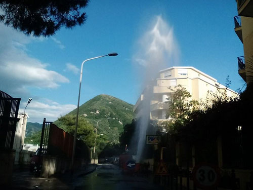Un monumento al bene più prezioso della città ? No. Una semplice, ennesima, tubatura rotta. E' questa la causa che questo pomeriggio ha generato una colonna d'acqua alta diversi metri e visibile anche da notevole distanza. L'episodio è avvenuto nel rione Scanzano, alle spalle delle Terme di Stabia. I lavori di stesura dei cavi della fibra ottica sono giunti anche qui, nella zona collinare della città di Castellammare di Stabia. Ed anche qui hanno causato danni, gli stessi che per mesi hanno caratterizzato i lavori nelle strade del centro cittadino.