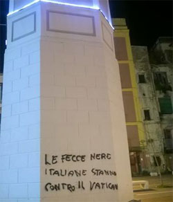 E il tutto deve essere stato fatto alla luce del giorno visto che stamattina di questa scritta non vi era traccia e che la stessa è stata notata solo nel tardo pomeriggio. A questo punto inutile sottolineare che deve essere fatta giustizia, deve essere individuato colui che ha imbrattato uno dei tanti simboli della città. E deve essere punito, deve pagare di tasca propria l'eliminazione della scritta.
