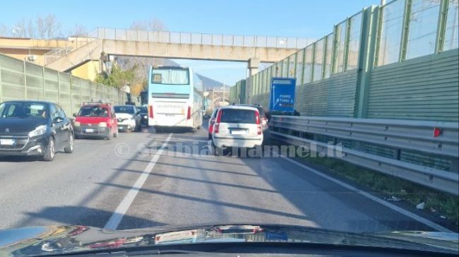 Incidente stradale questa mattina sulla statale ss145 Sorrentina a pochi metri dai caselli autostradali di Castellammare di Stabia. Tre le vetture coinvolte in quello che, dalle prime ipotesi, sembra essere stato un tamponamento a catena. Fortunatamente non si sarebbero registrati feriti, mentre diversi danni sono stati riportati dalle vetture coinvolte. L’impatto, la cui dinamica è ancora da chiarire, è avvento poco prima delle 8. Un orario di intenso traffico su quel tratto di strada con tantissime auto dirette ai luoghi di lavoro. Per questo, inevitabilmente – come sempre accade in queste situazioni – si sono formate lunghe code d’auto sia in direzione Napoli che Sorrento. In particolare, una lunga coda di vetture si è formata fin oltre i caselli, arrivando ad occupare parte dell’uscita di Castellammare di Stabia sulla Napoli-Salerno.